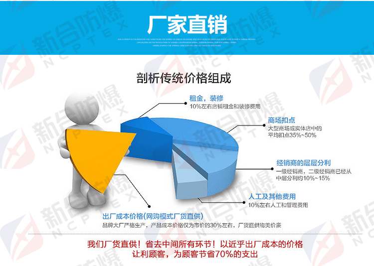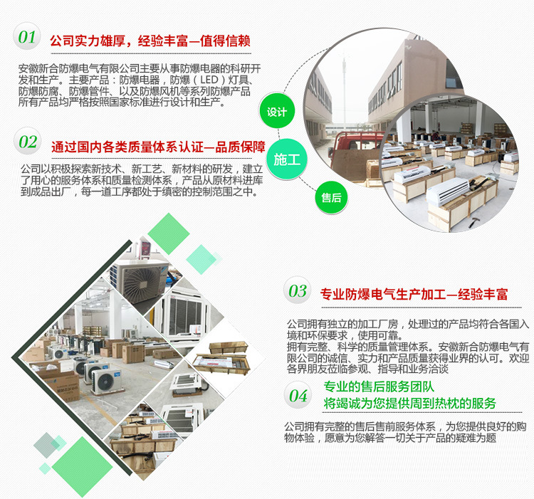 安 徽新合防爆電氣有限公司主要從事防爆電器的科研開發(fā)_和生產(chǎn)。主要產(chǎn)品:防爆電器,防爆(led)燈具、防爆防腐、防爆管件、以及防爆風(fēng)機(jī)等系列防爆產(chǎn)品 。對(duì)發(fā)_展,公司秉承“敢于創(chuàng)新、誠(chéng)信務(wù)實(shí)、質(zhì)量第一”的理念,所有產(chǎn)品均嚴(yán)格按照國(guó)家標(biāo)準(zhǔn)進(jìn)行設(shè)計(jì)和生產(chǎn),并以設(shè)計(jì)造型美觀、檢修方便、配套功能齊全、廣泛應(yīng)用于石油、化工、鋼鐵、冶金、礦山、消防及燃?xì)、鐵路、電力、部隊(duì)等各個(gè)領(lǐng)域。 對(duì)員工,公司恪守“人性至上、成就有意愿的人、讓大家有尊嚴(yán)的生活為根本,充分引爆人人潛力,讓每個(gè)人自信工作的同時(shí),快樂的獲得財(cái)富,獲得成長(zhǎng)”。 對(duì)客戶,公司承諾“讓客戶買的有尊嚴(yán)的三不承諾:1、不亂報(bào)價(jià)格,誤導(dǎo)客戶!2、不拖延貨期,耽誤客戶使用!3、售后服務(wù)問題不逃避,1個(gè)小時(shí)內(nèi)給出讓客戶滿意的答案! 公司以積極探索新技術(shù)、新工藝、新材料的研發(fā)_,建立了用心的服務(wù)體系和質(zhì)量檢測(cè)體系,產(chǎn)品從原材料進(jìn)庫到成品出廠,每一道工序都處于縝密的控制范圍之中。公司始終密切關(guān)注和跟蹤防爆行業(yè)的發(fā)_展動(dòng)態(tài),不斷地進(jìn)行技術(shù)升級(jí)改造,保持產(chǎn)品工藝技術(shù)與加工檢測(cè)設(shè)備的先進(jìn)性。 新合防爆實(shí)施雙贏合作戰(zhàn)略,在競(jìng)爭(zhēng)激烈的市場(chǎng)經(jīng)濟(jì)環(huán)境下,與廣大經(jīng)銷商和供應(yīng)商通力合作,廣泛建立戰(zhàn)略合作聯(lián)盟,實(shí)現(xiàn)優(yōu)勢(shì)互補(bǔ),雙贏誠(chéng)信經(jīng)營(yíng)的共同發(fā)_展。 新合防爆著力于以人為本,以客戶為中心的管理團(tuán)隊(duì)、專業(yè)化員工團(tuán)隊(duì)、專業(yè)服務(wù)中心及專業(yè)服務(wù)部。營(yíng)銷和服務(wù)網(wǎng)絡(luò)已覆蓋全國(guó)市場(chǎng),能夠?qū)蛻舻男枨、期望和滿意持續(xù)的保持,并承諾在1小時(shí)內(nèi)為客戶提供高績(jī)效、專業(yè)化和敏捷性的售前、售中及售后服務(wù)!