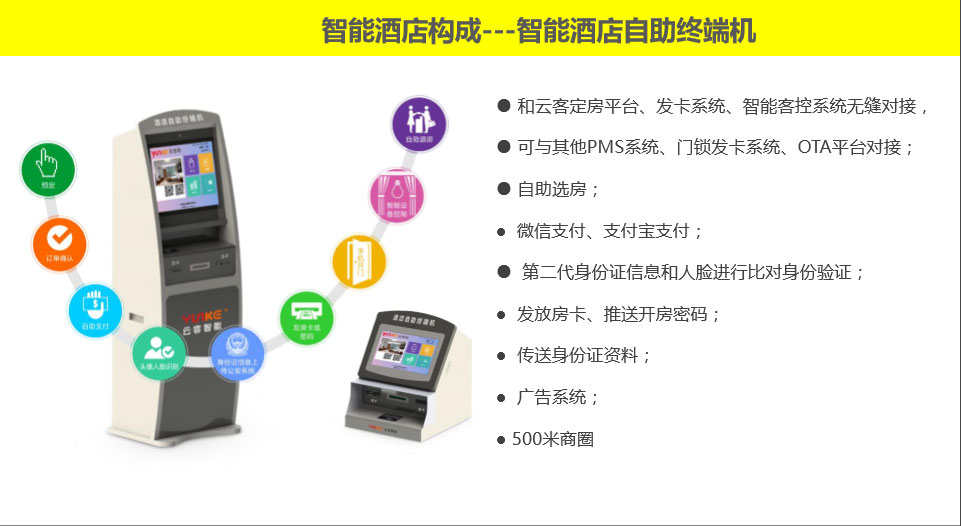 佳翼康智能推出的酒店智能自助終端機及智能酒店平臺,可以完成訂房、選房、身份證比對、上傳資料、支付、發(fā)卡等入住過程,顧客在這個過程中完全不需要與酒店工作人員打交道,是一種全新的訂房和入住體驗。