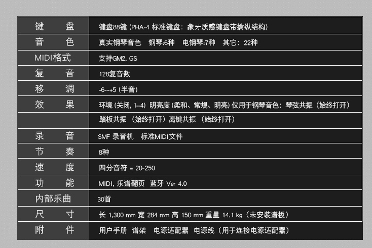 電源線(配套電源適配器)選購(另售)耳機電流消耗直流電 15伏/ 2500毫安 尺寸(不包含譜架)寬1380 毫米 深 485 毫米 高 850 毫米 尺寸(包含琴架及譜架) 寬 1380 毫米 深 485 毫米 高 1000 毫米 重量(包含譜架) 重量 48公斤