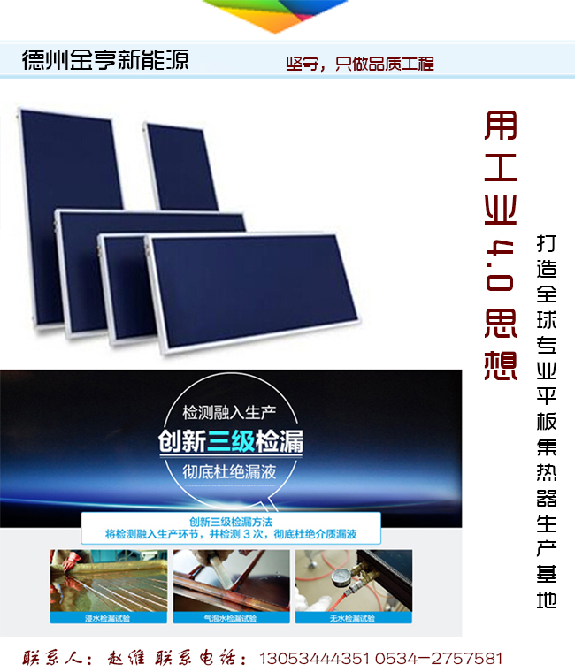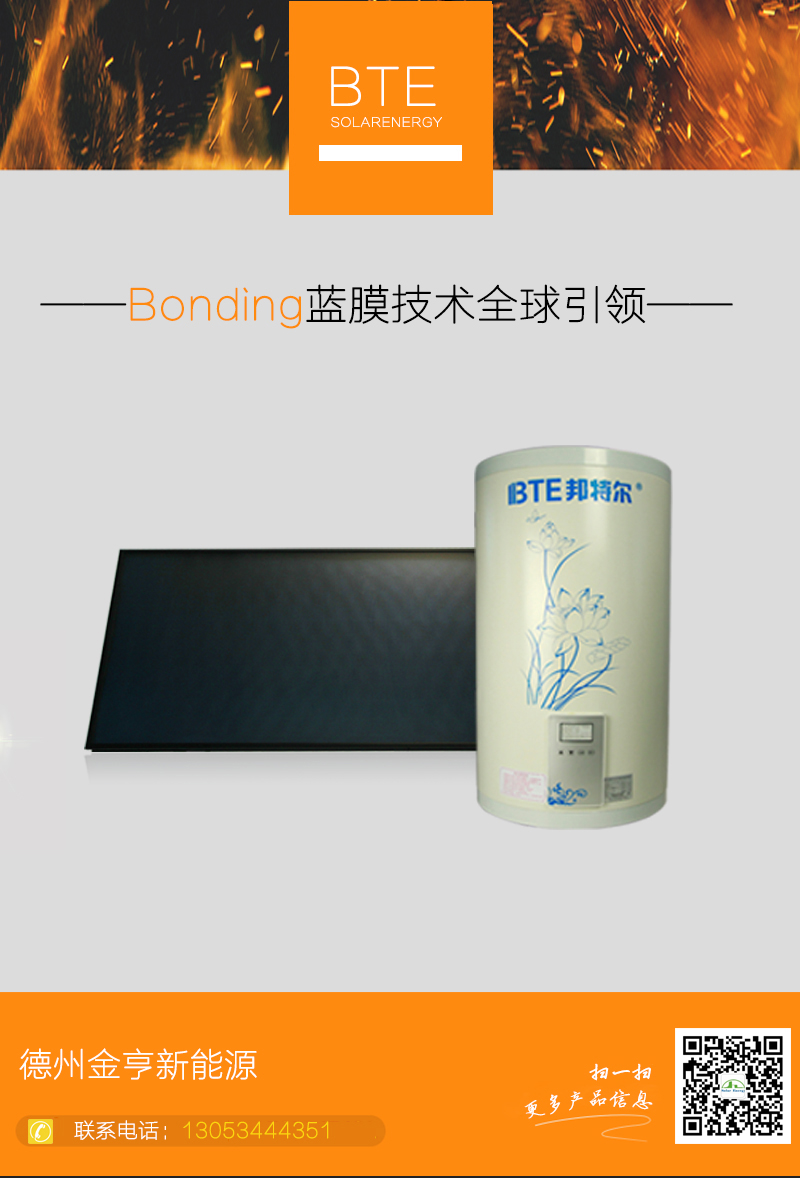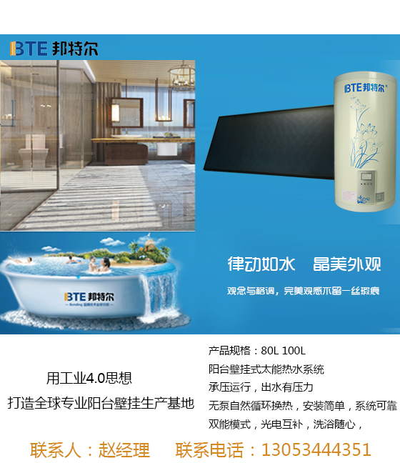 德州金亨新能源有限公司,專注于太陽(yáng)能光熱的應(yīng)用領(lǐng)域,主要產(chǎn)品:平板集.器(高效/高寒/高溫)、太陽(yáng)能熱水器、u型管集熱器(高效/長(zhǎng)壽型)熱管集熱器、無(wú)水箱熱水器、線性聚焦集熱器、蒸汽集熱器、熱儲(chǔ)存器等。太陽(yáng)能熱水器產(chǎn)品介紹:陽(yáng)臺(tái)壁掛式太陽(yáng)能熱水器是專門為高層、小高層住宅配套設(shè)計(jì)開(kāi)發(fā),彌補(bǔ)了傳統(tǒng)的太陽(yáng)能熱水器由于先天不足無(wú)法實(shí)現(xiàn)與建筑及環(huán)境完美結(jié)合的遺憾,這一開(kāi)發(fā)真正體現(xiàn)了太陽(yáng)能與建筑及環(huán)境體化的完美結(jié)合。陽(yáng)臺(tái)壁掛太陽(yáng)能屬于分離式太陽(yáng)能熱水系統(tǒng),水箱放置在陽(yáng)臺(tái)內(nèi),集熱器放置在建筑南里面陽(yáng)臺(tái)上。它的熱性能高、安 全性好、使用壽命長(zhǎng)、容量大的同時(shí),降低生產(chǎn)成本,安 裝靈活快捷
