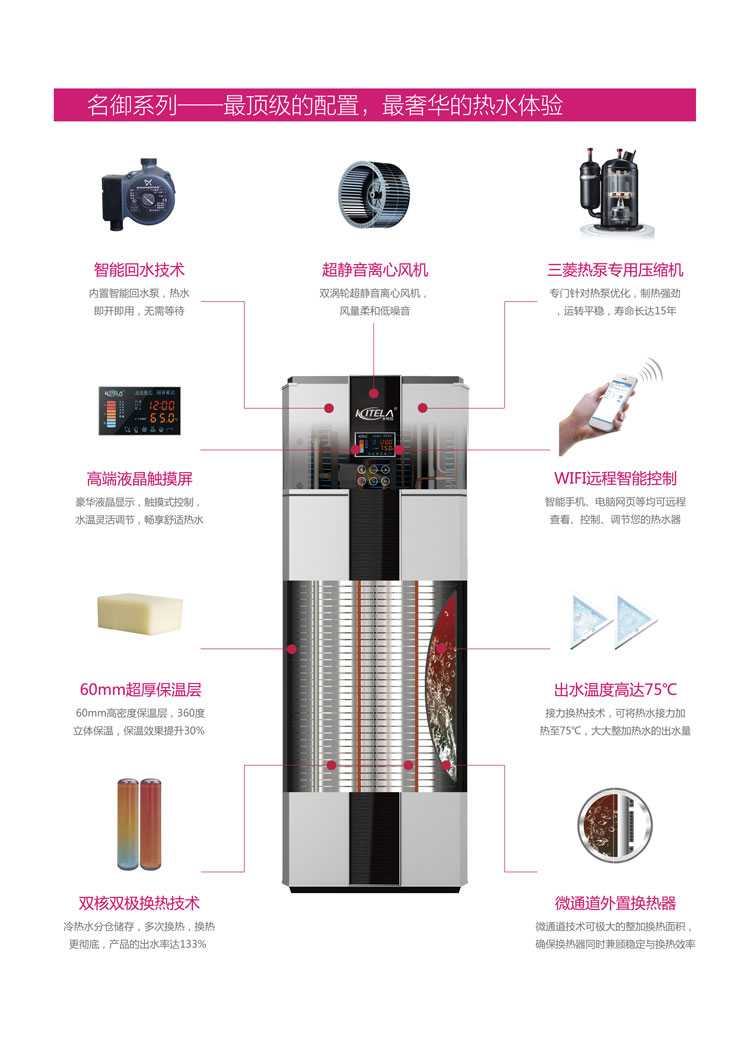 雙核雙極換熱技術(shù),冷熱水分倉儲存,多次換熱,換熱更徹底,產(chǎn)品的出水率達(dá)133%;
