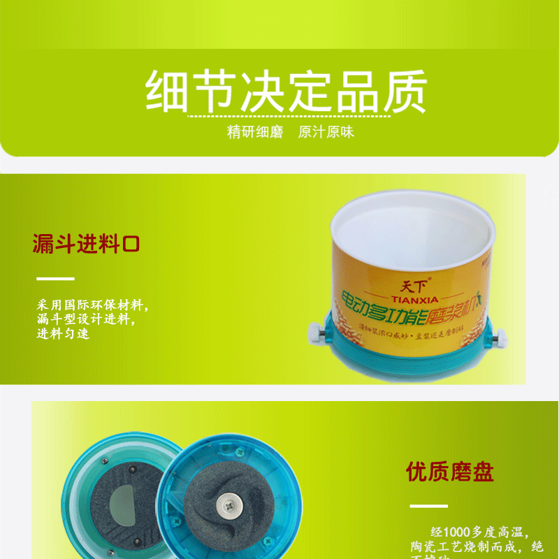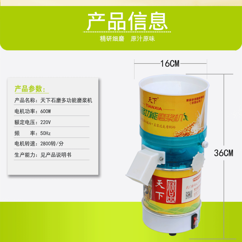 天下牌電動(dòng)式多功能石磨豆?jié){機(jī),不盡解決了刀片打磨的營(yíng)養(yǎng)流失問(wèn)題,傳承了千年的養(yǎng)生之道,精巧小磨盤(pán)無(wú)掉砂問(wèn)題,零污染,零輻射,從真正意義上做到了安 全快速研磨豆?jié){。