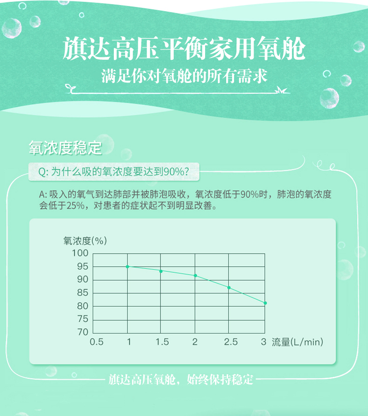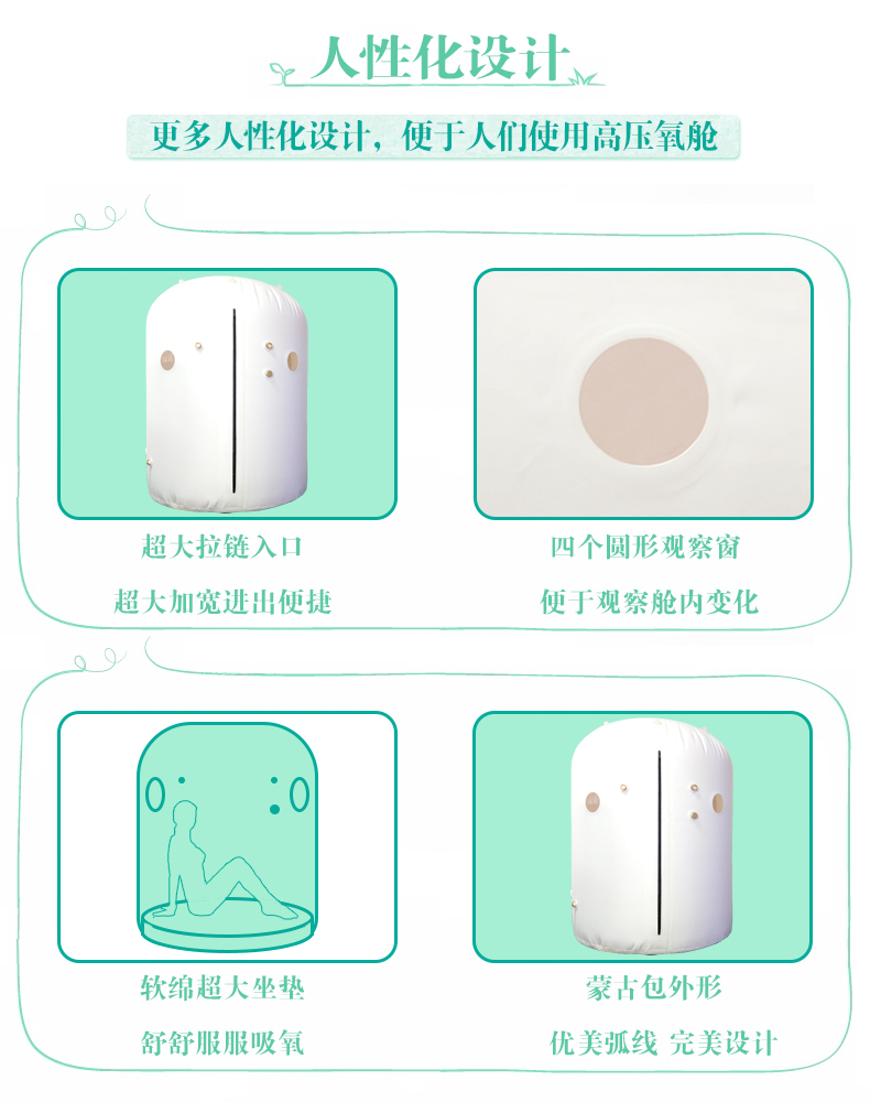 高壓氧艙的介紹:旗達高壓家用理療氧艙由一個高強度醫(yī) 用級tpu納米復(fù)合纖維材料的艙體和一臺凈化空氣動力設(shè)備組成,搭配支撐架,床墊等配件。操作方便簡單,給使用者提供最大化的舒適、安 全體驗。該理療艙內(nèi)模擬1.3個大氣壓力環(huán)境,人置身在一個30kpa的艙體中呼吸,根據(jù)亨利法則 《氣體在液體中的溶解度隨著壓力的升高而增加》,由于壓力的升高,大量的氧氣溶解在血液中,人體血氧溶解量明顯增加,并且提高血氧分壓,提高血氧彌散能力,使氧的有效彌散半徑加大,增加組織內(nèi)氧含量和儲氧量,從而起到保健功效。