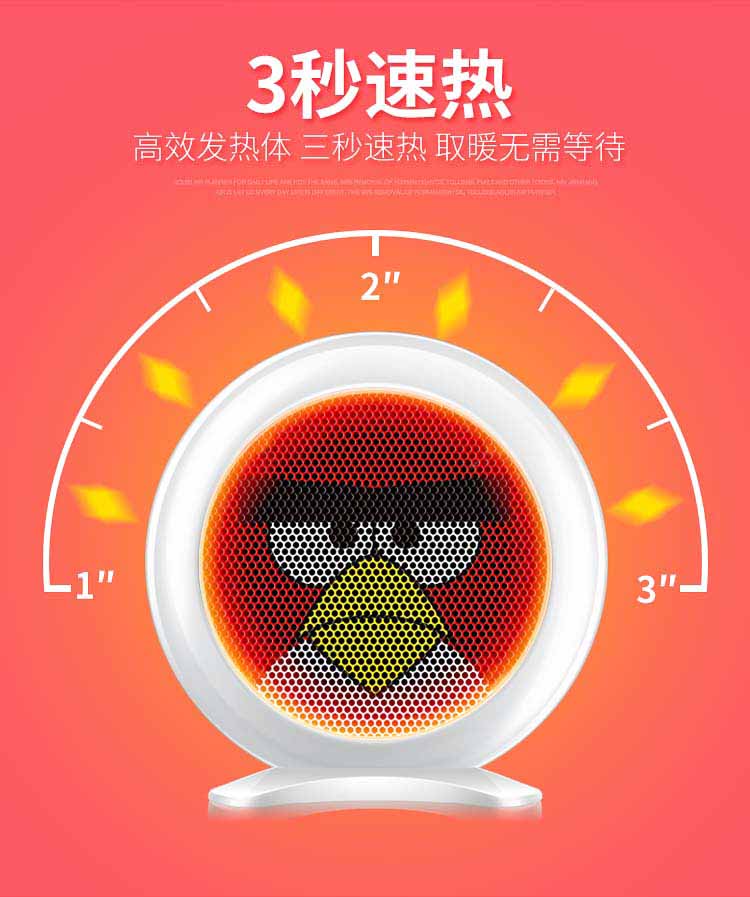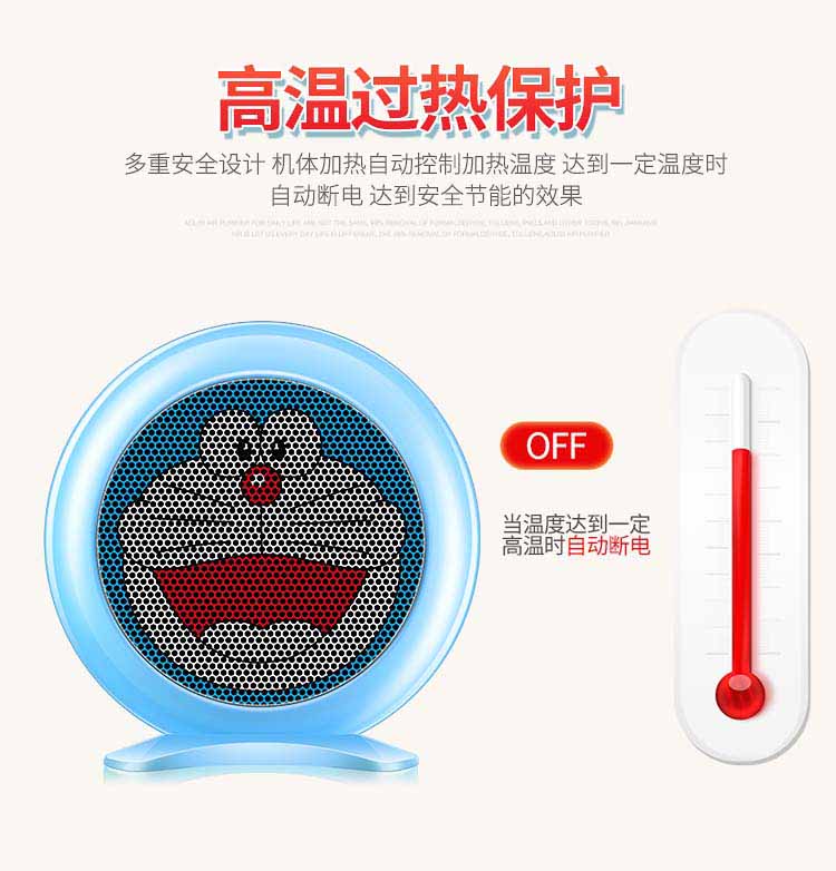 暖風(fēng)機(jī)小巧輕便想放哪里放哪里,想吹哪里吹哪里,可以脫了鞋子把暖風(fēng)機(jī)放在腳邊,分分鐘就能讓雙腳暖烘烘,迷你暖風(fēng)機(jī)取暖器生產(chǎn)商,還能快速烘干潮濕的鞋襪,它還是一個想燃起來都困難的取暖器,機(jī)身整體采用阻止可燃性氣體與燃燒產(chǎn)生的熱輻射兩者的結(jié)合,這么冷的天氣敲鍵盤,手總是抖三抖,必須買一個暖風(fēng)機(jī)來解救你,達(dá)到圖書館級別的靜音,使用時不會影響自己及他人,可以放在桌上,也可以帶它去圖書館,一般的暖風(fēng)機(jī)啟動之后需要20秒加熱后才能出暖風(fēng),這在冬天來說簡直要命,億帆叮當(dāng)喵迷你暖風(fēng)機(jī)即開即熱,取暖無需等待,暖風(fēng)機(jī)外觀圓潤,它比空調(diào)節(jié)能,比暖寶寶省事,與周圍環(huán)境百搭,不用的時候就是一個裝飾品,暖風(fēng)機(jī)底部有防傾倒保護(hù)裝置,必須放在堅實(shí)的水平位置上使用,暖風(fēng)機(jī)采用金屬發(fā)熱絲加云母片作為發(fā)熱體,發(fā)熱組件具有熱效高、升溫迅速均勻、無明火、無耗氧,長期使用不會產(chǎn)生悶感覺,內(nèi)置過熱保護(hù),傾倒斷電開關(guān)裝置,安 全可靠,迷你便攜