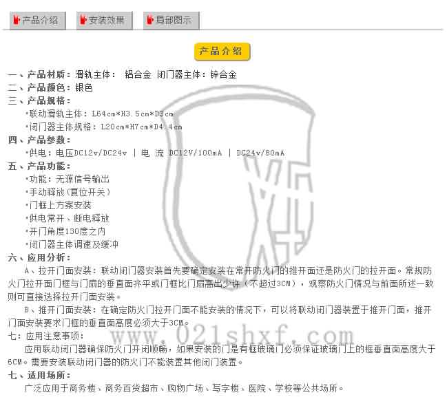 b、推開門面安 裝:在確定防火門拉開門面不能安 裝的情況下,可以將聯(lián)動閉門器裝置于推開門面,推開門面安 裝要求門框的垂直面高度必須大于3cm。