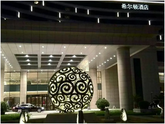 新疆烏魯木齊希爾頓戶外中心水景池雕塑,采用祥云圖案,金屬球直徑3000mm,重達1.5噸,供電為220v轉20v分組供電。此酒店戶外雕塑設計集合金屬雕塑和燈光兩個部分,要求加工制作方對雕塑工藝造型材質和強電供電原理都有一定的掌控能力。手工鍛造焊接做舊啞黑色,并鑲嵌led防水燈帶,造型大方夜晚看起來格外的醒目迷人。