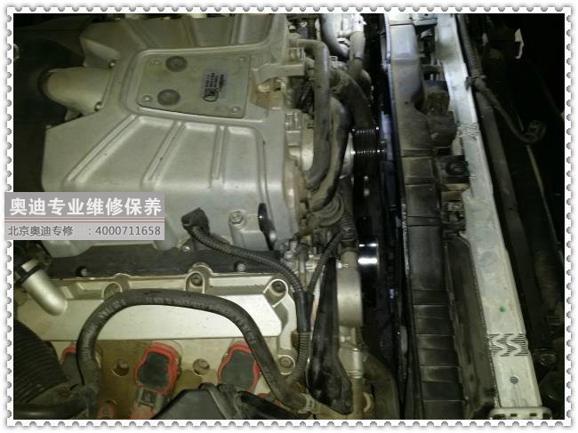 我們解決這個(gè)問(wèn)題只需要更換幾套輪即可:其中包括大輪一套,漲緊輪兩只,導(dǎo)向輪一只。奧迪車型的本款車,更換這些組件需要拆卸前杠,水箱冷凝器,拆修比較麻 煩。本次更換作業(yè),使用了原廠的正品組件,整個(gè)費(fèi)用下來(lái)也只有4s的一半左右,真是非常的實(shí)惠。