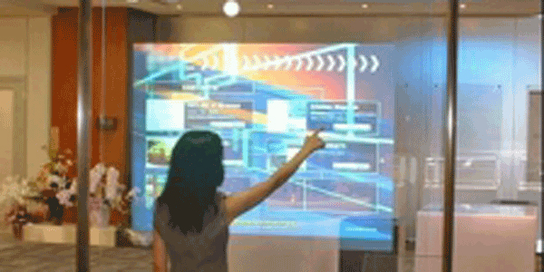 通過背投形式將虛擬影像疊加在特制的玻璃或者其他透明物體上,監(jiān)控設(shè)備將對人的手指接觸點(diǎn)進(jìn)行監(jiān)控與感知,并將獲得的數(shù)據(jù)傳輸回電腦處理, 最后確定手指與虛擬圖像的位置,最終完成整個互動投影效果。
