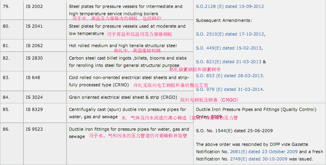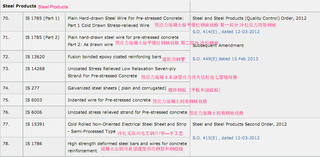 印度bis 認(rèn)證是由印度國家標(biāo)準(zhǔn)局(bureau of indian standard),頒發(fā)的認(rèn)證證書。凡是強(qiáng)制認(rèn)證的產(chǎn)品,獲證后產(chǎn)品可打上相應(yīng)的isi 標(biāo)識,申請方獲證后憑借bis 證書以及產(chǎn)品上面的isi標(biāo)識順利進(jìn)出印度海關(guān),打入印度市場內(nèi)部。允許所有的國外制造商進(jìn)行所出口產(chǎn)品的申請。 性能特點(diǎn) 目前越來越多不同種類的鋼鐵產(chǎn)品已經(jīng)被列入強(qiáng)制認(rèn)證的清單中, 相關(guān)出口企業(yè)一定要及時(shí)了解市場動(dòng)態(tài), 做好出口認(rèn)證相關(guān)準(zhǔn)備工作。 鋼鐵產(chǎn)品強(qiáng)制認(rèn)證清單, 請參考 下表詳情: