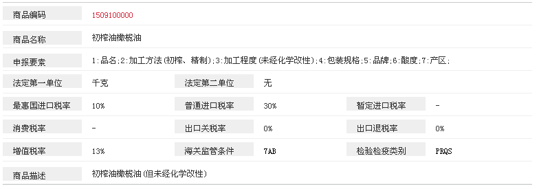 1:品名;2:加工方法(初榨、精制);3:加工程度(未經(jīng)化學(xué)改性);4:包裝規(guī)格;5:品牌;6:酸 度;7:產(chǎn)區(qū);