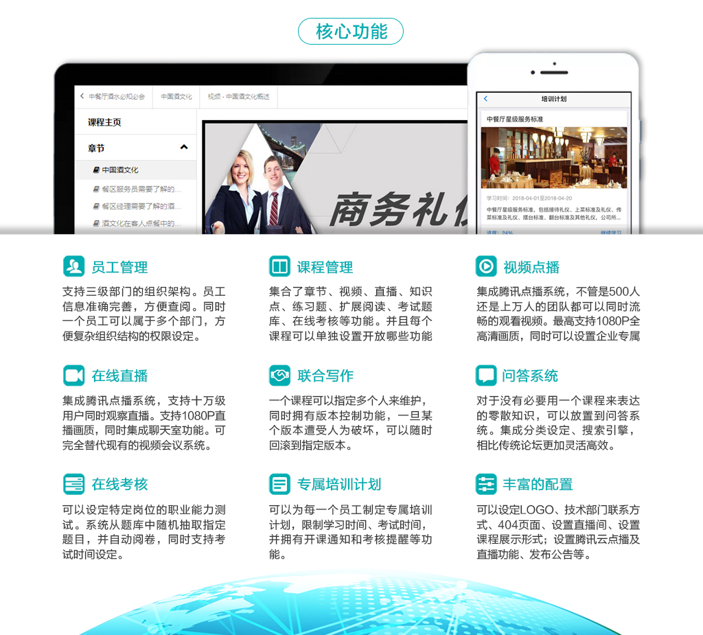 企業(yè)在線教育系統(tǒng)網(wǎng)埔e-training核心功能: