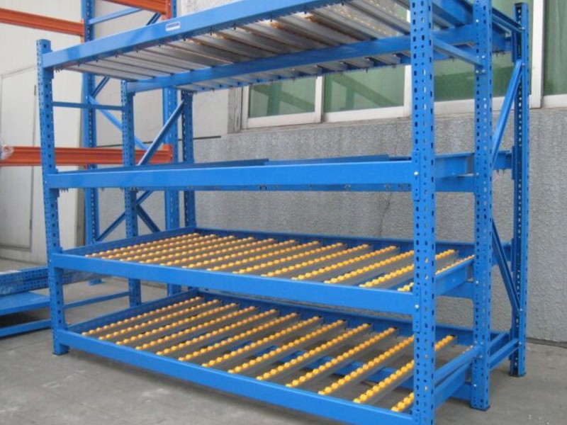 重型流利式貨架每層前后橫梁之間設置滾輪式鋁合金或鈑金流力條,呈一定坡度(3°左右)放置。