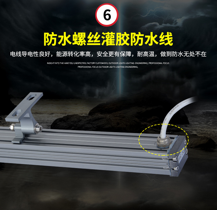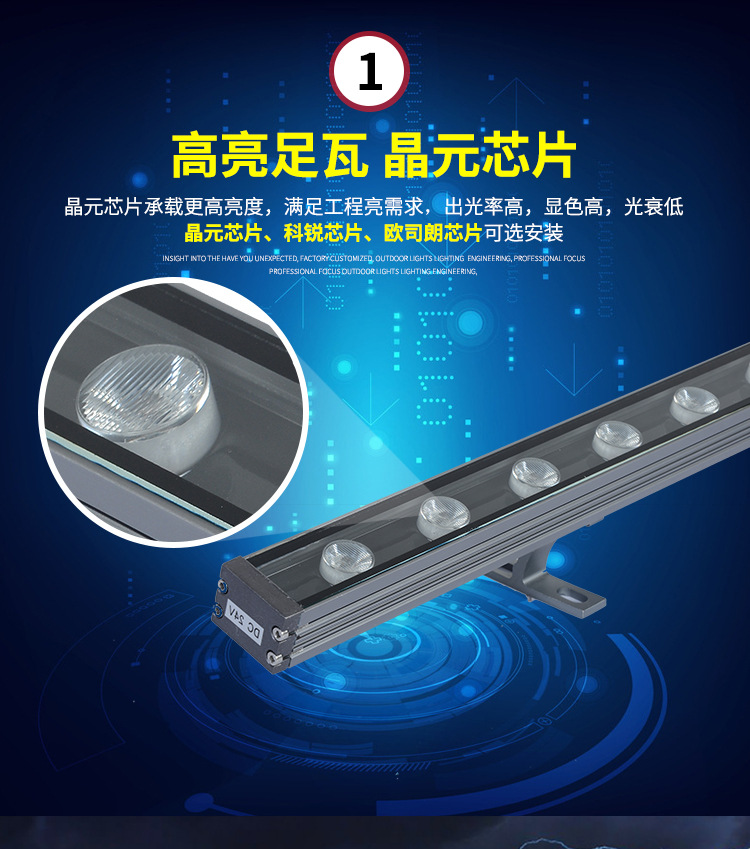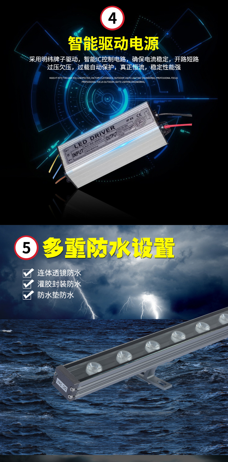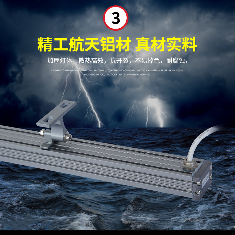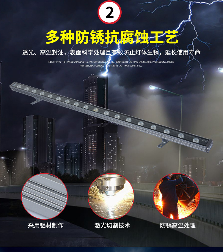 led洗墻燈采用進(jìn)口壓鑄鋁材,表面氧化處理 超強的抗腐蝕性、抗壓性,卓越的防水性,內(nèi)部孔位全防水,采用先進(jìn)的硅膠灌封技術(shù)灌封及結(jié)構(gòu)防水技術(shù),耐150度以上高溫、不老化、燈體密封性好,采用高透光鋼化玻璃,安 全性好,品質(zhì)有保障