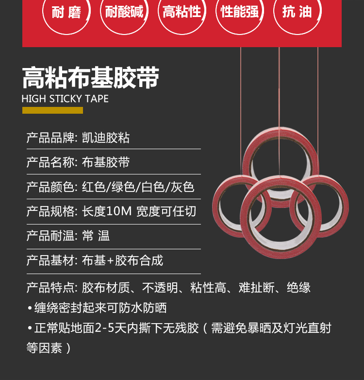 凱迪布基膠帶,易撕、色彩艷麗、耐磨、耐溫、防水耐酸 堿 。