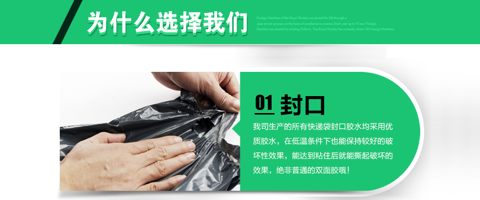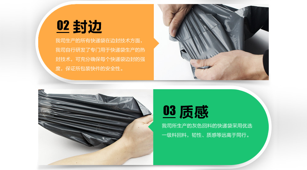 恒勁寶生產(chǎn)供應(yīng)的所有快遞袋封口膠水均采用優(yōu)質(zhì)膠水,在低溫環(huán)境下也能保持良好的破壞性效果,能達(dá)到粘住后就能撕起破壞的效果;封邊技術(shù)完善,由公司自行研發(fā)專業(yè)用于快遞封口生產(chǎn)的熱封技術(shù),可充分確保每個快遞袋邊封的強度,保證所包裝快遞袋的安 全性。