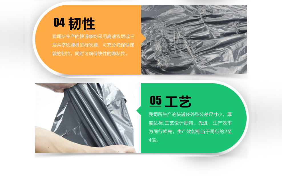 恒勁寶的快遞袋均采用高速雙層或三層共擠吹膜機進行吹膜,可充分確保快遞袋的韌性,同時可確?旒[私性。