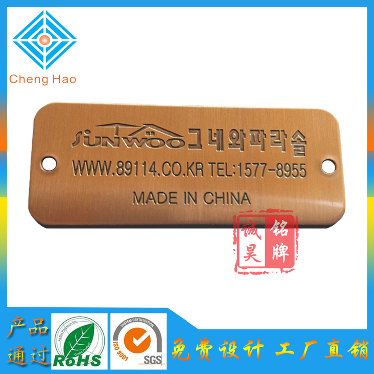 不銹鋼銘牌也叫腐蝕標牌,不銹鋼腐蝕銘牌,腐刻標牌,都是采用腐蝕工藝制作而成,沖壓不銹鋼標牌,腐蝕商標,腐蝕logo,不銹鋼鏡面商標,拉絲不銹鋼銘牌,名稱不同,我們很多客戶叫法不一樣,我們專業(yè)全部統(tǒng)一出名稱方便大家了解。
