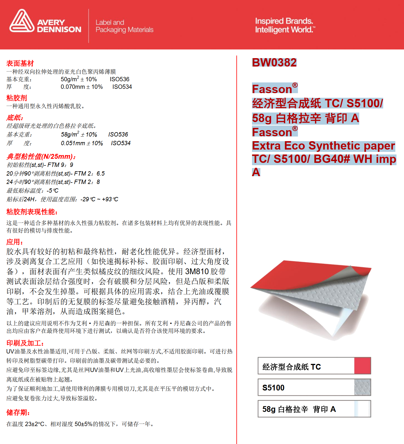 蘇州工業(yè)園區(qū)SUNTECK TECNOLOGY非標(biāo)彩印模切供應(yīng)廠商-受托印刷AVERY DENNISON BW0382-Fasson經(jīng)濟(jì)型PP合成紙 TC/ S5100/58g 白格拉辛 背印 A Fasson Extra Eco Synthetic paper TC/ S5100/ BG40# WH imp A