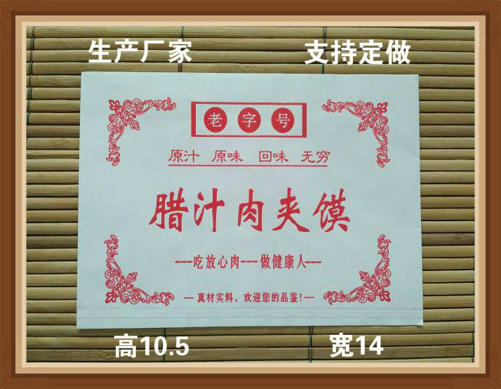 肉夾饃紙袋由河北春暖紙塑包裝出品。本公司生產(chǎn)的肉夾饃紙袋采用食品級防油紙制作,防油防水環(huán)保衛(wèi)生。按材質(zhì)顏色分為白防油紙肉夾饃袋、牛皮紙色肉夾饃紙袋。在上個世紀(jì)90年代,一般的食品包裝普遍采用低壓手提袋或者塑料袋包裝,對于一些高溫、油炸等產(chǎn)品不能滿足其防油、防高溫、防潮的要求,同時期有的采用純紙張作為包裝物,雖然解決了防高溫的問題,但是防油、防潮的問題依然沒有解決,直到21世紀(jì)初,才有了防油材料的問世,徹底解決了上述問題,并逐漸風(fēng)靡全國。
