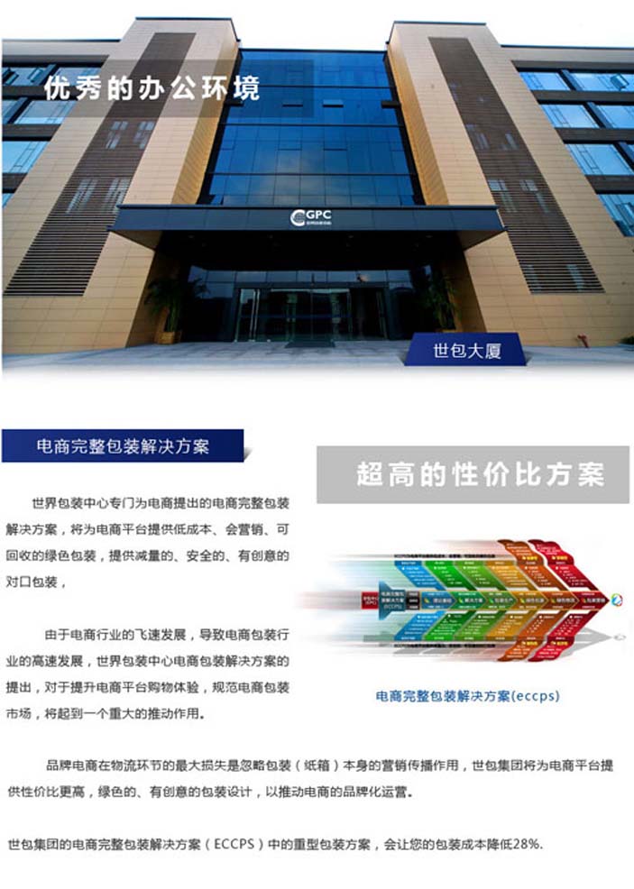 世界包裝中心是一家以投資與服務全球包裝業(yè)為使命的經(jīng)營性企業(yè),是由世界包裝組織批準在中國設立的世界性包裝產(chǎn)業(yè)科教創(chuàng)意交流服務性平臺,于2010年7月12日在香港成立世界包裝中心控股集團有限公司,2010年9月14日成為世界包裝組織(WPO)正式成員,定位于全球包裝業(yè)促進聯(lián)盟及經(jīng)濟共同體,是世界包裝組織的重要成員之一,2012年7月8日世包大廈開業(yè)慶典,標志著世界包裝中心揭開了新的一頁。