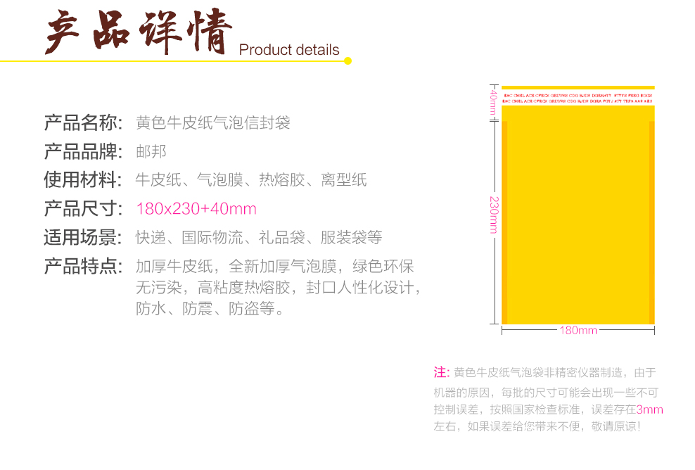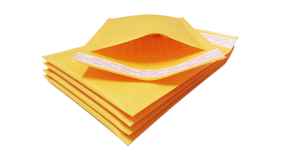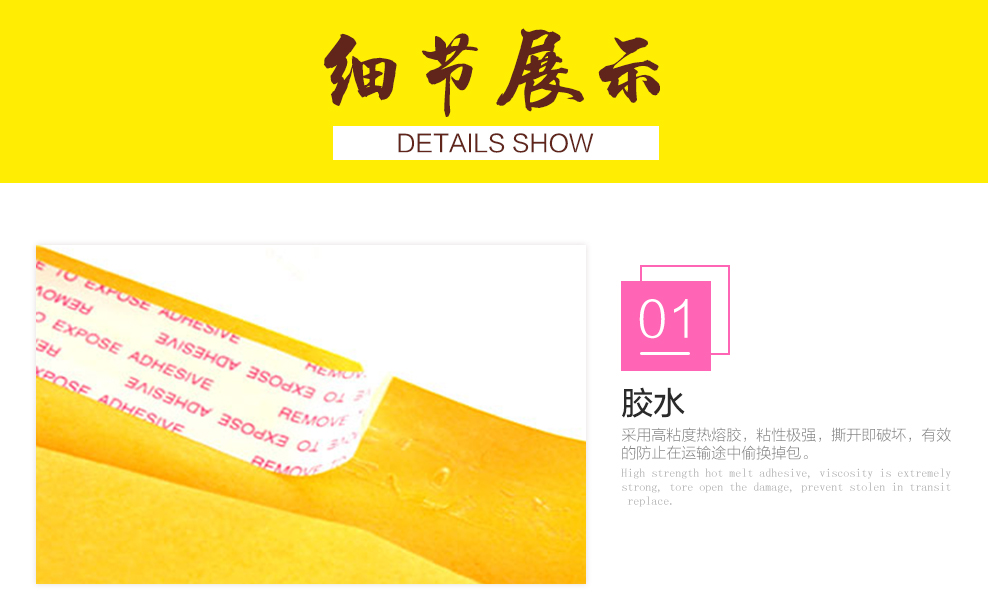 恒勁寶黃色牛皮紙氣泡袋使用的原材料綠色環(huán)保無污染,外層是由加厚牛皮紙制作,封口采用高粘度熱熔膠,粘性極強(qiáng),撕開即破壞,能有效的防止快遞在路途中的偷換掉包。