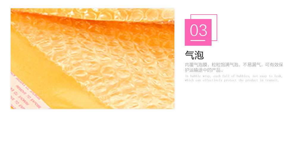氣泡袋內(nèi)部是全新加厚氣泡膜內(nèi)覆氣泡膜,粒粒飽滿氣泡,不易漏氣,可有效保護(hù)運(yùn)輸途中的產(chǎn)品,起到良好的緩沖作用,防止所裝物品因壓、碰、跌落而損壞。