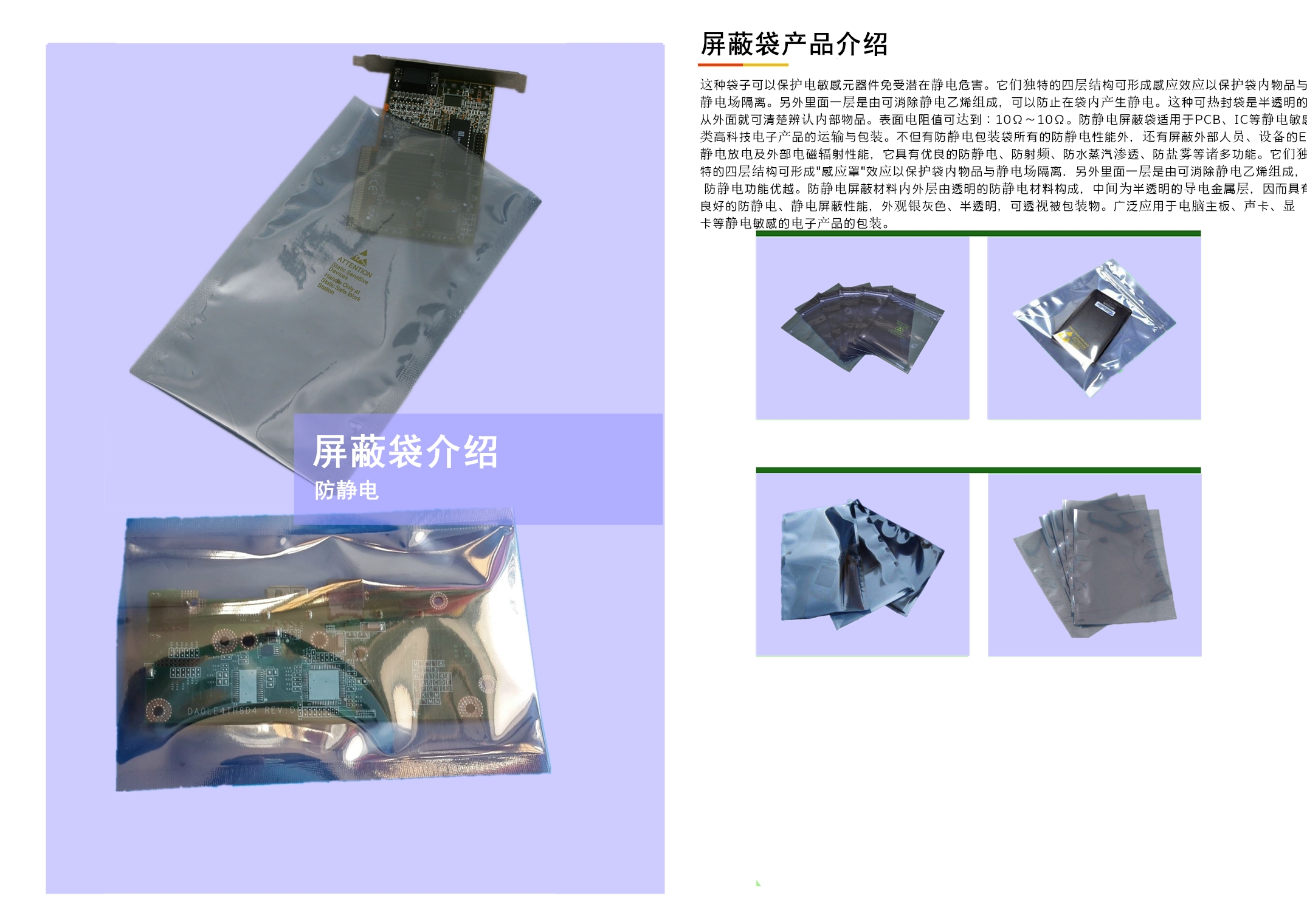 這種袋子可以保護(hù)電敏感元器件免受潛在靜電危害。它們獨特的四層結(jié)構(gòu)可形成感應(yīng)效應(yīng)以保護(hù)袋內(nèi)物品與靜電場隔離。另外里面一層是由可消除靜電乙烯組成,可以防止在袋內(nèi)產(chǎn)生靜電。這種可熱封袋是半透明的,從外面就可清楚辨認(rèn)內(nèi)部物品。表面電阻值可達(dá)到:10ω~10ω。防靜電屏蔽袋適用于pcb、ic等靜電敏感類高科技電子產(chǎn)品的運輸與包裝。不但有防靜電包裝袋所有的防靜電性能外,還有屏蔽外部人員、設(shè)備的esd靜電放電及外部電磁輻射性能,它具有優(yōu)良的防靜電、防射頻、防水蒸汽滲透、防鹽 霧等諸多功能。它們獨特的四層結(jié)構(gòu)可形成"感應(yīng)罩"效應(yīng)以保護(hù)袋內(nèi)物品與靜電場隔離.另外里面一層是由可消除靜電乙烯組成, 防靜電功能優(yōu)越。防靜電屏蔽材料內(nèi)外層由透明的防靜電材料構(gòu)成,中間為半透明的導(dǎo)電金屬層,因而具有良好的防靜電、靜電屏蔽性能,外觀銀灰色、半透明,可透視被包裝物。可制作平口袋、拉鏈袋、風(fēng)琴袋、立體袋等形式。廣泛應(yīng)用于電腦主板、聲卡、顯卡等靜電敏感的電子產(chǎn)品的包裝;