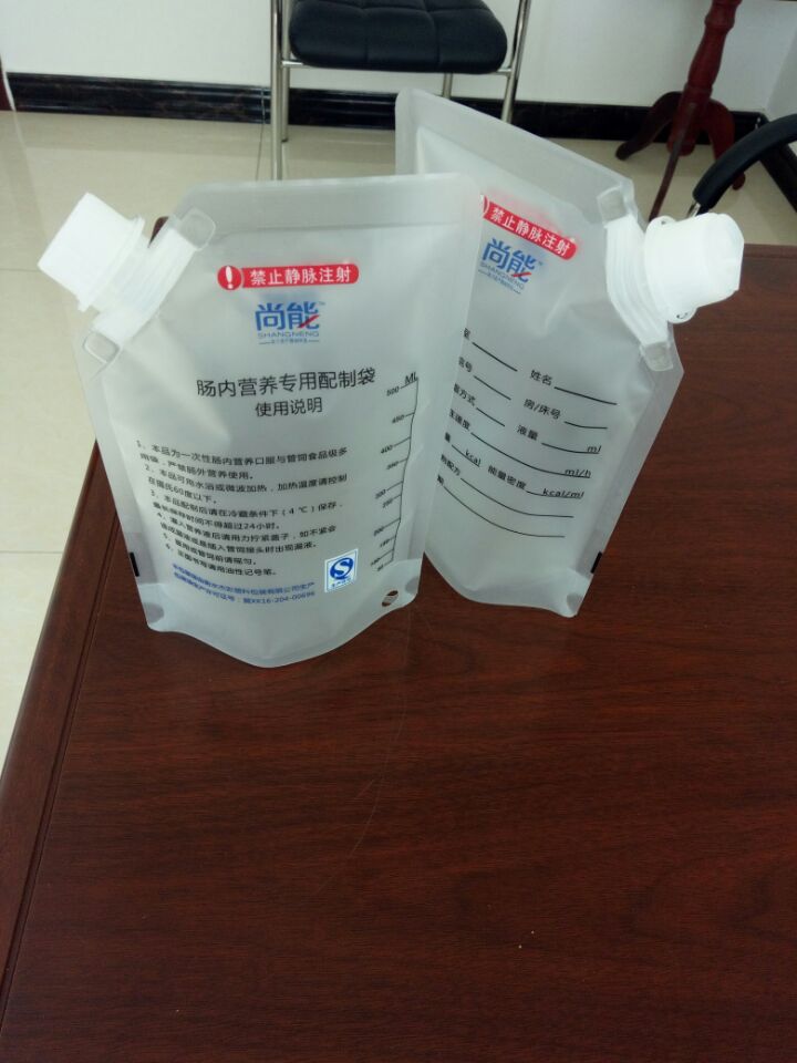 3. 本包裝袋吸嘴口徑大,便于灌裝,且人工、機器灌裝都可通過。瓶口便于密封,為營養(yǎng)制劑 的貯存和運輸提供了安 全、便捷的保證。