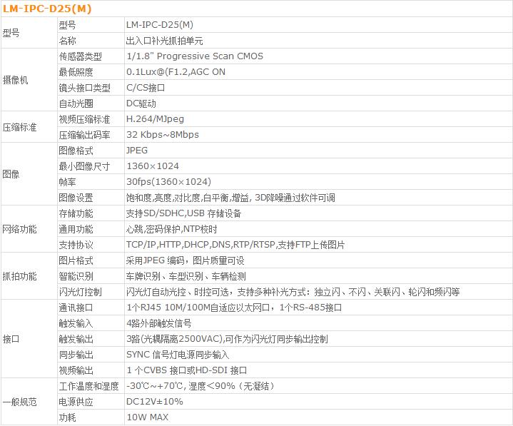 lm-ipc-d25系列出入口補(bǔ)光抓拍單元是由防護(hù)罩、補(bǔ)光燈以及高清智能攝像機(jī)組成,內(nèi)置攝像機(jī)采用高清晰逐行掃描cmos,具有清晰度高、照度低、幀率高、色彩還原度好等特點(diǎn)。