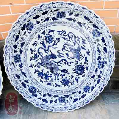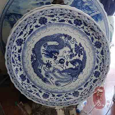 景德鎮(zhèn)陶瓷瓷廠生產(chǎn)的陶瓷大瓷盤適用于商務辦公場合、酒店大堂裝飾、酒店餐廳巨型器皿、大堂隔間屏風、工地竣工紀念、名人肖像館紀念等。景德鎮(zhèn)大瓷盤常規(guī)規(guī)格在1米-1.8米,畫面有蟲魚鳥獸,梅蘭竹菊,蓮花,植物,樓閣,牡丹,龍紋,庭院國畫等。由于大瓷盤直徑太大,通過模具制作是根本不可行的。因此制作這款陶瓷大瓷盤從泥胚的制作開始都是人工手工拉坯、修坯