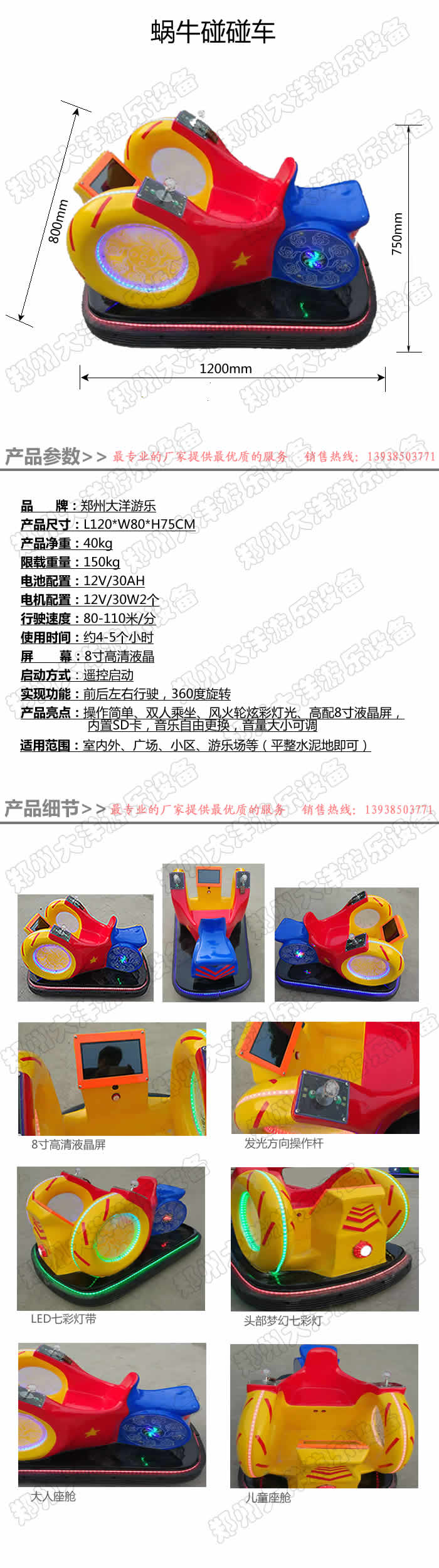 蝸牛碰碰車款式新穎炫酷,燈光絢麗,前后兩個車輪的燈光都是七彩自閃的,很吸引小朋友的眼球,車頭配有8寸液晶顯示屏,可最大可存放1000個視頻;車子行駛時按按鍵會有“滴滴”的喇叭聲。車子前面或后面的座位都可操作搖桿,操作簡單方便,可雙人乘坐、旋轉、碰撞。