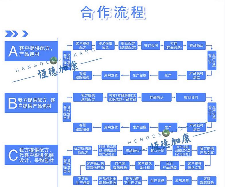oem(origin equipment manufacture)的基本含義是定牌生產(chǎn)合作,俗稱“代工”。恒德加康公司能為您提供你所需要的藍(lán)帽批文產(chǎn)品貼牌代工,全球進(jìn)口的原料采購,10萬級的廠房生產(chǎn)線,從源頭到成品,質(zhì)量永遠(yuǎn)是行業(yè)第一。康琪壹佰貼心服務(wù),讓您從心底滿意。