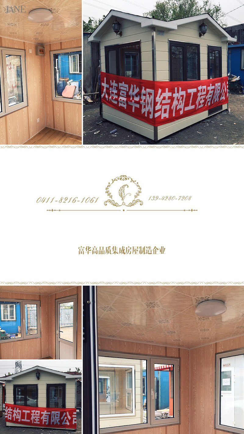 大連富華鋼結(jié)構(gòu)工程有限公司,大連富華集成房屋,是東北較早集研發(fā)、生產(chǎn)、銷售和經(jīng)營(yíng)崗?fù)、環(huán)保廁所、售貨亭、集裝箱房、輕鋼集成房屋等于一體的專業(yè)型生產(chǎn)企業(yè),現(xiàn)擁有產(chǎn)品系列十余種,產(chǎn)品數(shù)量多達(dá)100余款。本公司成品房屋要銷售地區(qū)有,土庫(kù)曼斯坦、澳洲、新西蘭、美國(guó)、東北、陜北、華北、沈陽(yáng)、甘肅、西安 、重慶、西藏、云南、西南地區(qū)包括四川全省各地。本公司引進(jìn)各種新型高科技材料,造型美觀、舒適隔熱、經(jīng)久耐用、整體運(yùn)輸、隨處可安 。大部分產(chǎn)品都屬手工作業(yè)容易被模仿,為保證消費(fèi)者的合法利益,請(qǐng)放心選擇“大連富華”,因?yàn)槲覀儗I(yè)、有經(jīng)驗(yàn)、富于創(chuàng)新。