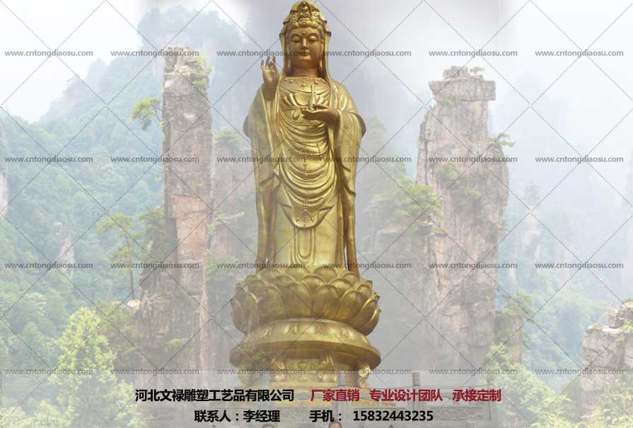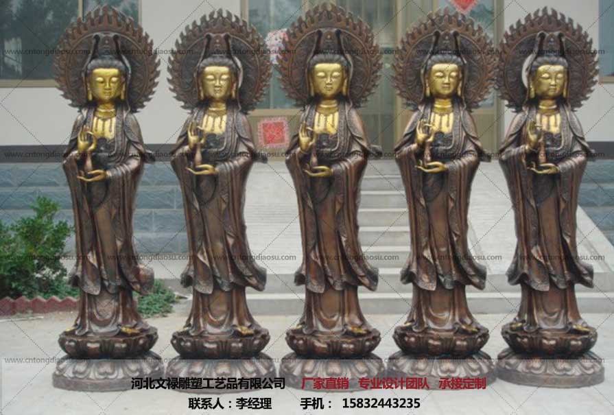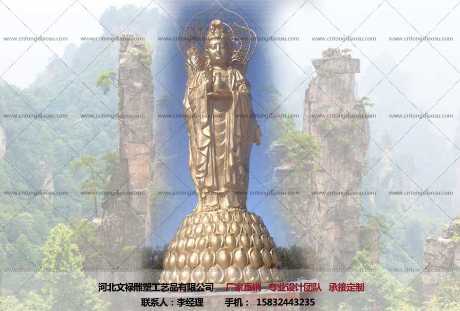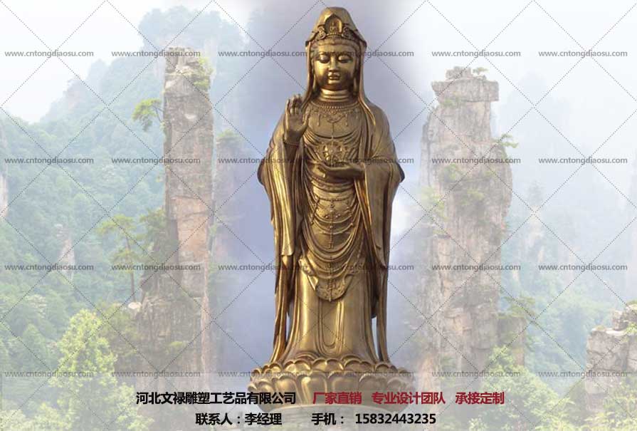 觀音菩薩又作觀世音菩薩、觀自在菩薩、光世音菩薩等,他相貌端莊慈祥,經常手持凈瓶楊柳,具有無量的智慧和神通,大慈大悲,普救人間疾苦。當人們遇到災難時,只要念其名號,便前往救度,所以稱觀世音。銅觀音的種類有很多,像是三面觀音、千手觀音、凈瓶觀音、蓮座觀音、送子觀音等多種觀音樣式。