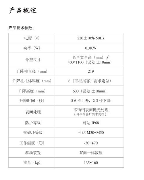 升降柱規(guī)格(mm):長400-450×寬400-450×高820