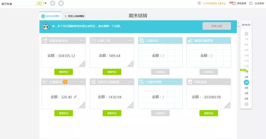 稍微動(dòng)動(dòng)手指,月末結(jié)轉(zhuǎn)的工作效率提升80%。 進(jìn)入系統(tǒng)預(yù)置多種結(jié)轉(zhuǎn)模板:銷(xiāo)售商品成本、工資、折舊、損益、稅金等,每項(xiàng)結(jié)轉(zhuǎn)模板放在傳統(tǒng)軟件,都是分開(kāi)操作。
