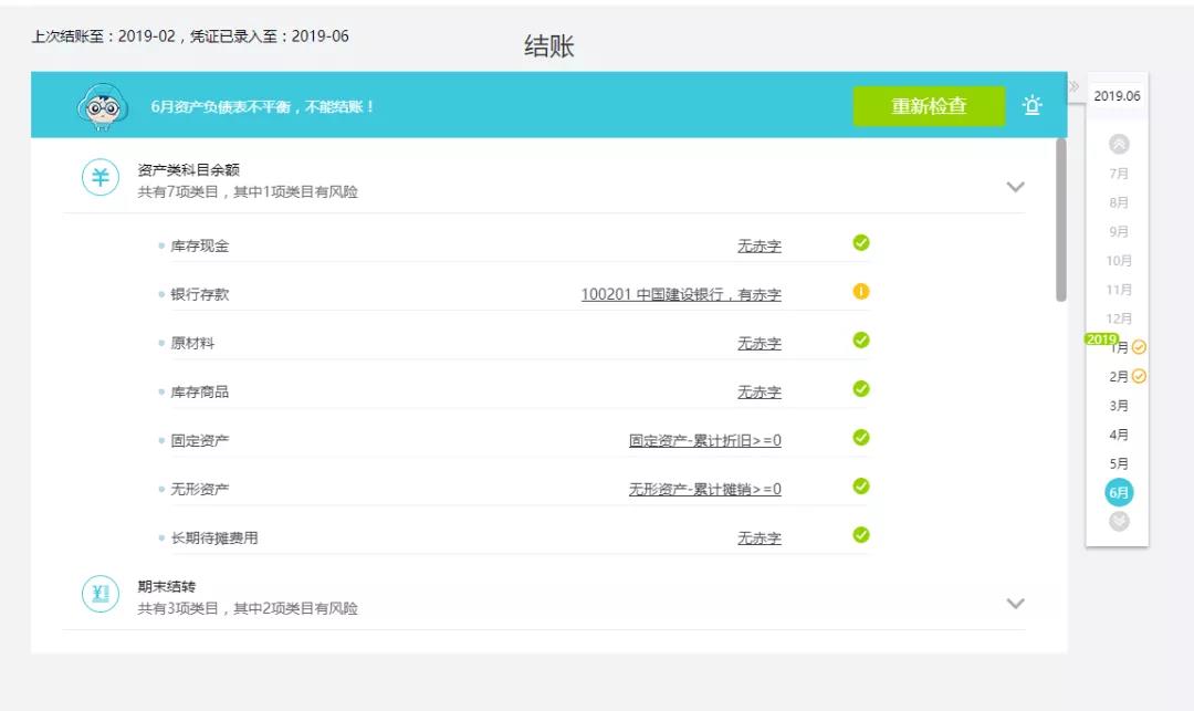 當(dāng)結(jié)賬內(nèi)容出現(xiàn)異常,點(diǎn)異常提示快速調(diào)整,如:資產(chǎn)負(fù)債表不平衡,直接點(diǎn)不平衡項(xiàng)進(jìn)入資產(chǎn)負(fù)債表,可查看造成不平衡的具體項(xiàng),并快速修改。