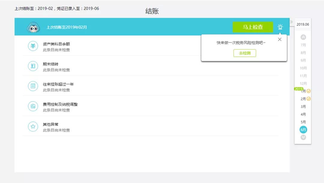 通過(guò)【馬上檢查】,一鍵查看系統(tǒng)設(shè)定的5大類(lèi)檢查項(xiàng):資產(chǎn)類(lèi)、期末結(jié)轉(zhuǎn)、往來(lái)款項(xiàng)掛賬情況、費(fèi)用控制納稅調(diào)整、其他異常。