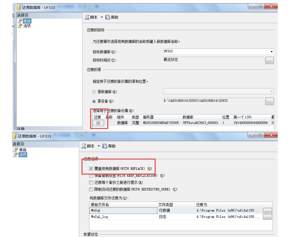 step3:在點擊上一步中最后一個確定前,注意在界面上的選擇用于還原的備份集中,需要勾選上選擇的備份數(shù)據(jù)文件,另外在常規(guī)中需要勾選上覆蓋現(xiàn)有數(shù)據(jù)庫。