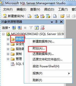 step1:以windows身份,登錄management studio,然后點擊數(shù)據(jù)庫三個字右鍵,然后點擊附加: