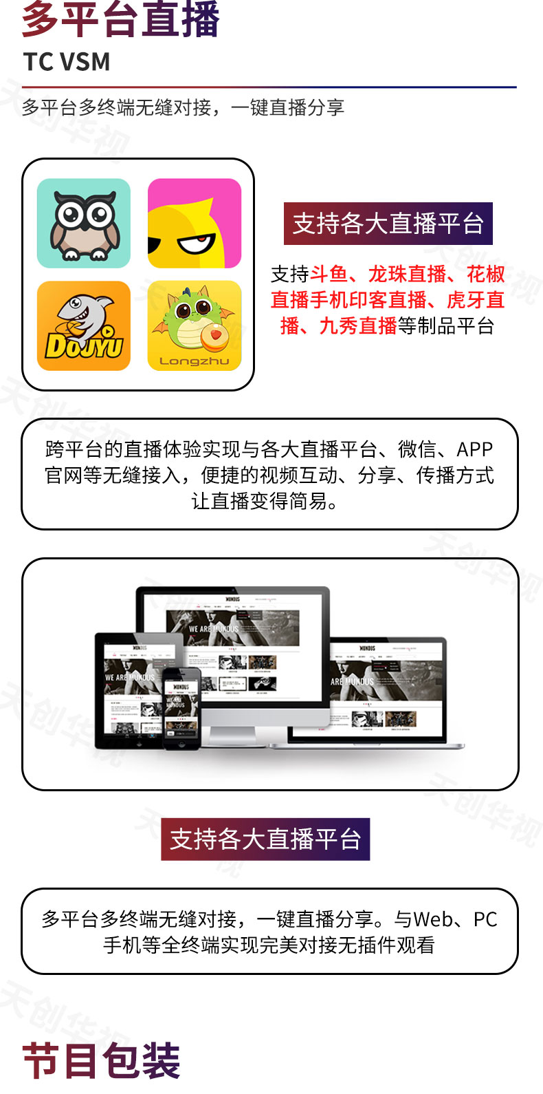 多平臺多終端對接,一鍵直播分享。與web、pc、手機(jī)等全終端實現(xiàn)對接無插件觀看,跨平臺的直播體驗實現(xiàn)與各大直播平臺、微信、app、官網(wǎng)等接入,便捷的視頻互動、分享、傳播方式,讓直播變得簡易。