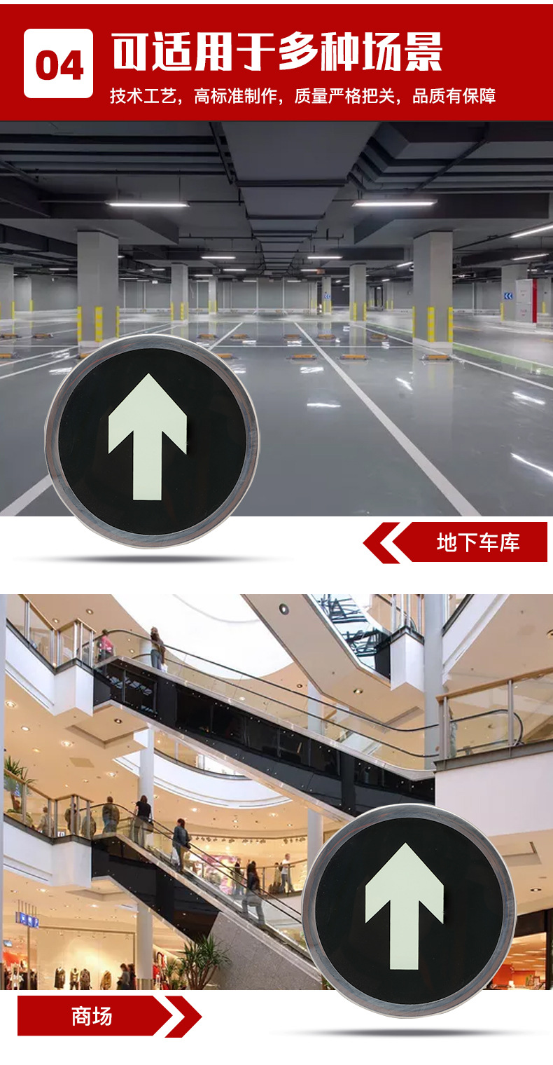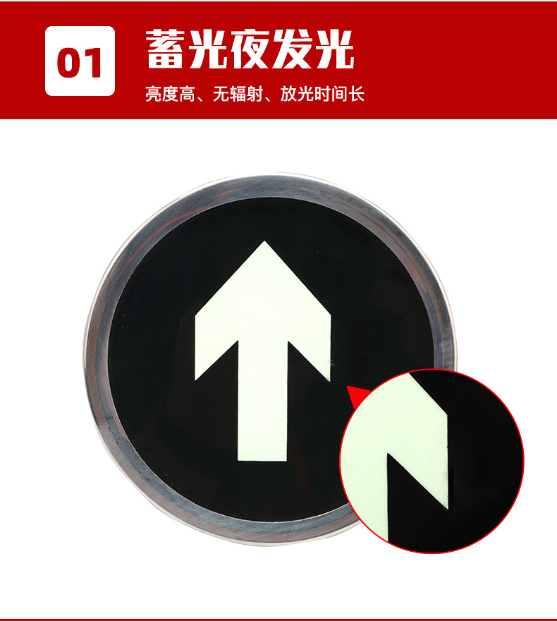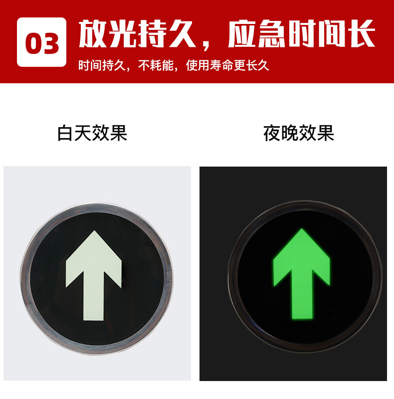 工藝:雙層8+5mm厚鋼化玻璃,面層反面印刷長余輝蓄光箭頭/安 全色綠底,不銹鋼鏡面 框,中間熱熔夾合