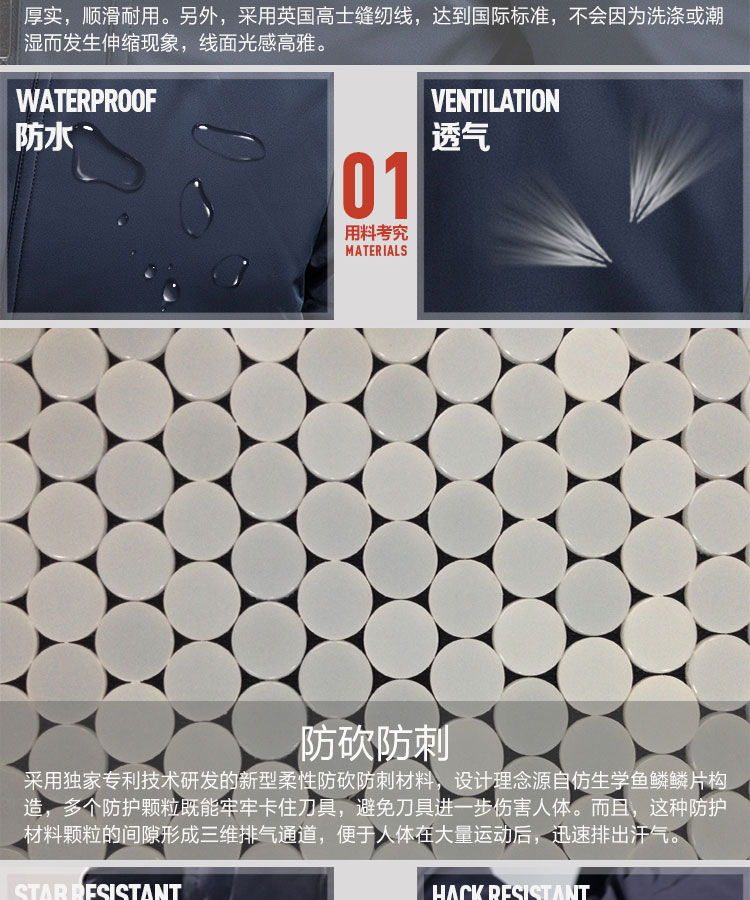 夾克款柔性防護服內(nèi)芯采用獨家專利技術(shù)研發(fā)的新型柔性防護復(fù)合材料精心做工而成。外套甄選進口聚酯面料,手感細膩,防水防風(fēng),抗皺性和保型性強。