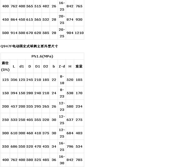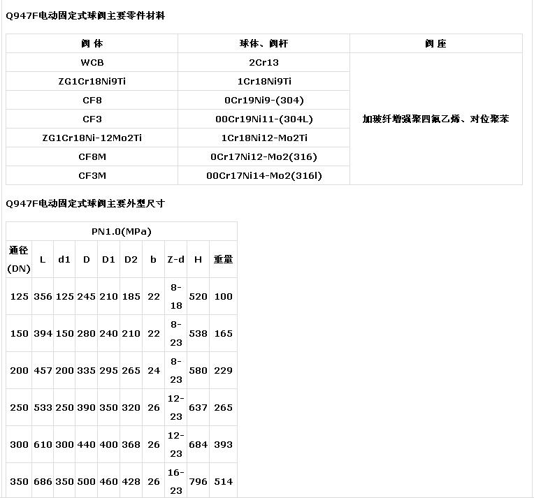 產(chǎn)品名稱:電動(dòng)固定式球閥產(chǎn)品型號(hào):q947f產(chǎn)品口徑:dn15-250產(chǎn)品壓力:0.6~6.4mpa產(chǎn)品材質(zhì):鑄鋼、不銹鋼、合金鋼等產(chǎn)品簡(jiǎn)介:制造標(biāo)準(zhǔn):中國(guó)gb、機(jī)械部jb、化工標(biāo)準(zhǔn)hg、美標(biāo)api、ansi、德標(biāo)din、日本jis、jpi、英標(biāo)bs生產(chǎn)。閥體材質(zhì):銅、鑄鐵、鑄鋼、碳鋼、wcb、wc6、wc9、20#、25#、鍛鋼、a105、f11、f22、不銹鋼、304、304l、316、316l、鉻鉬鋼、低溫鋼、鈦合金鋼等。工作壓力1.0mpa-50.0mpa。工作溫度:-196℃-650℃。連接方式:內(nèi)螺紋、外螺紋、法蘭、焊接、對(duì)焊、承插焊、卡套、卡箍。驅(qū)動(dòng)方式:手動(dòng)、氣動(dòng)、液動(dòng)、電動(dòng)。上;菹拈y門有限公司擁有全球最頂尖的生產(chǎn)設(shè)備和技術(shù)工程師,有能力按照各國(guó)標(biāo)準(zhǔn)以及各種行業(yè)標(biāo)準(zhǔn)生產(chǎn)制造優(yōu)質(zhì)閥門。聯(lián)系電話:15901687301 產(chǎn)品詳情q947f電動(dòng)固定式球閥主要性能規(guī)范型 號(hào)試驗(yàn)壓力ps(mpa)工作溫度(℃)適用介質(zhì)殼 體密封(液)密封(氣)q947f-101.5pn1.1pn0.6 mpa-29-200(加玻纖增強(qiáng)聚四氟乙烯)、-29-300(對(duì)位聚苯 )水、蒸汽、油品等q947f-16硝酸 等腐蝕性介質(zhì)強(qiáng)氧化性介質(zhì)q947f-25q947f-64醋酸 等腐蝕性介質(zhì)q947f-160尿素 等腐蝕性介質(zhì)q947f電動(dòng)固定式球閥主要零件材料