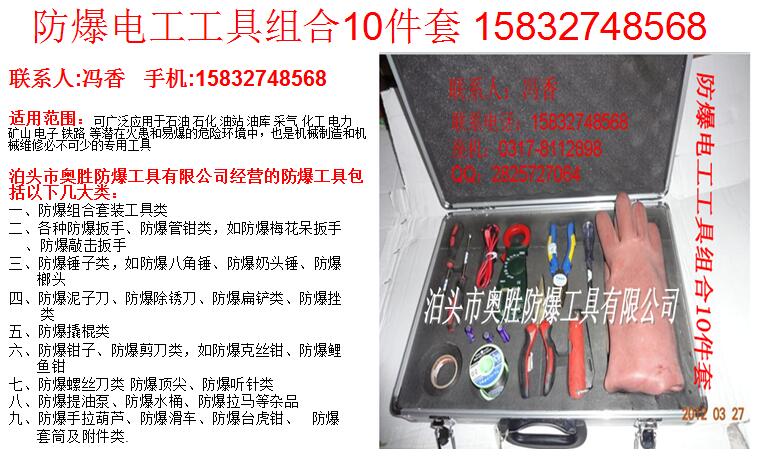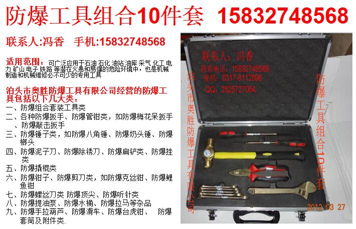 泊頭市奧勝防爆工具有限公司,專業(yè)生產(chǎn),專門針對石油管道,化工管道,液化氣管道,搶險維護(hù),維修堵漏設(shè)計生產(chǎn)的防爆組合工具:遼寧zhdg19/27/38/4650防爆電工工具組合10件深受廣大客戶好評。公司專業(yè)供應(yīng)防爆工具,防爆組合工具箱:遼寧zhdg19/27/38/4650防爆電工工具組合10件,防爆防靜電工具,防爆呆扳手,防爆梅花扳手,防爆活扳手,防爆管鉗,防爆鉗,防爆螺絲刀,防爆八角錘,防爆錘,防爆開口扳手,防爆敲擊扳手,防爆閥門扳手,防爆絲刷,防爆刀,防爆鏟等各種防爆工具,專用工具,組合工具箱等。