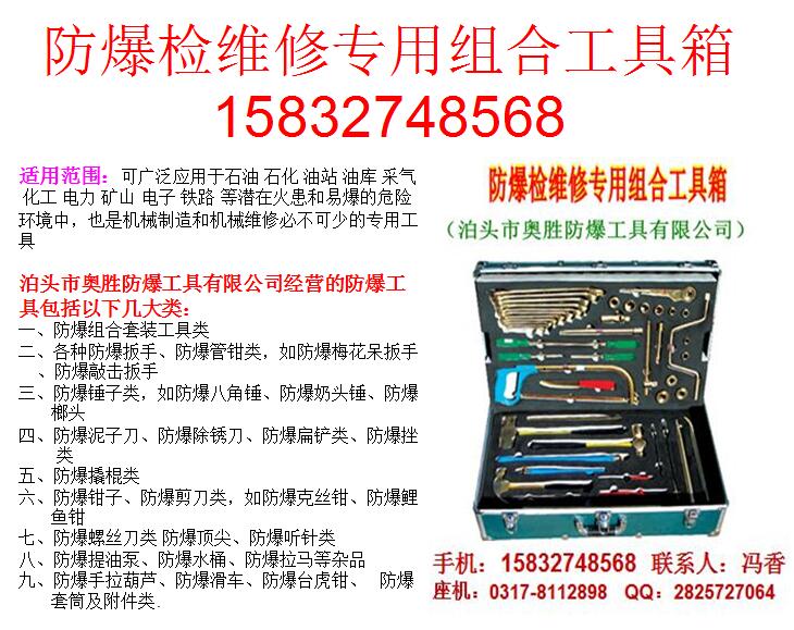 詳細(xì)地址:河北省滄州泊頭市經(jīng)濟(jì)技術(shù)開發(fā)區(qū)泊頭市奧勝防爆工具有限公司,專業(yè)生產(chǎn),專門針對(duì)石油管道,化工管道,液化氣管道,搶險(xiǎn)維護(hù),維修堵漏設(shè)計(jì)生產(chǎn)的防爆組合工具:青海jwx17/28/36/49/50防爆檢維修專用組合工具深受廣大客戶好評(píng)。公司專業(yè)供應(yīng)防爆工具,防爆組合工具箱:青海jwx17/28/36/49/50防爆檢維修專用組合工具,防爆防靜電工具,防爆呆扳手,防爆梅花扳手,防爆活扳手,防爆管鉗,防爆鉗,防爆螺絲刀,防爆八角錘,防爆錘,防爆開口扳手,防爆敲擊扳手,防爆閥門扳手,防爆絲刷,防爆刀,防爆鏟等各種防爆工具,專用工具,組合工具箱等。