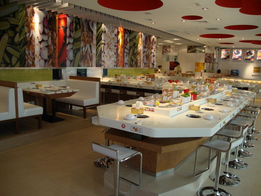 回轉(zhuǎn)設(shè)備可根據(jù)餐店使用面積及客戶要求進(jìn)行設(shè)計,我公司設(shè)備傳動系統(tǒng)采用密封式設(shè)計,輸送連帶結(jié)構(gòu)嚴(yán)謹(jǐn),運行安 全平穩(wěn),符合食品衛(wèi)生要求?梢怨(jié)省人力物力,客人在各自的座位上可隨意選擇擺放在輸送帶上的食物,無需服務(wù)員送上,同樣回轉(zhuǎn)輸送設(shè)備以其美觀、時髦、新奇、動感吸引著更多的顧客,使青少年所青睞。