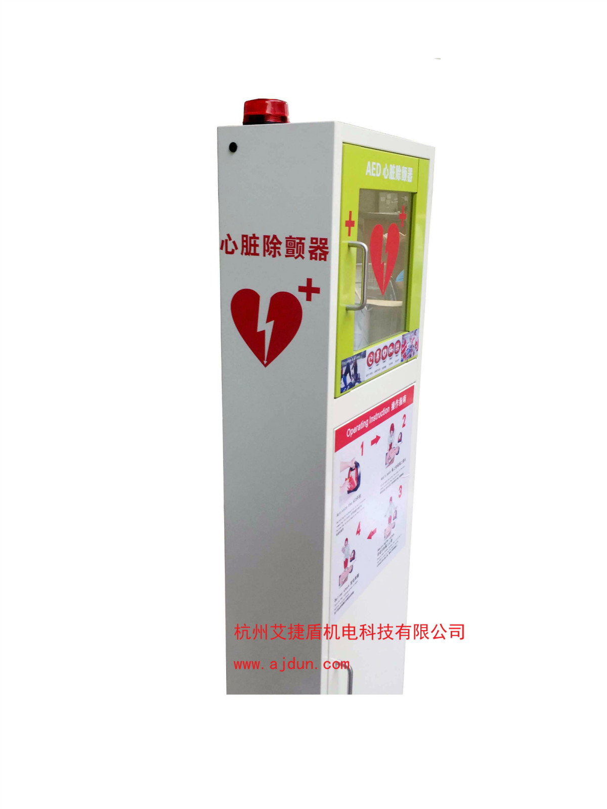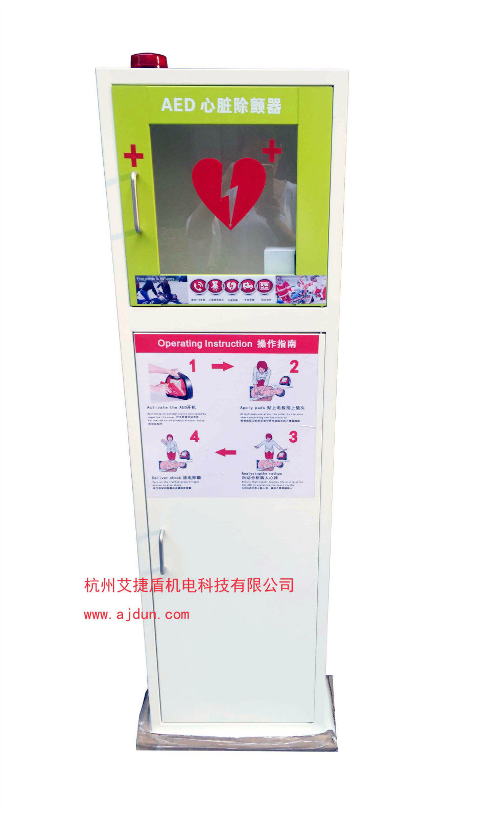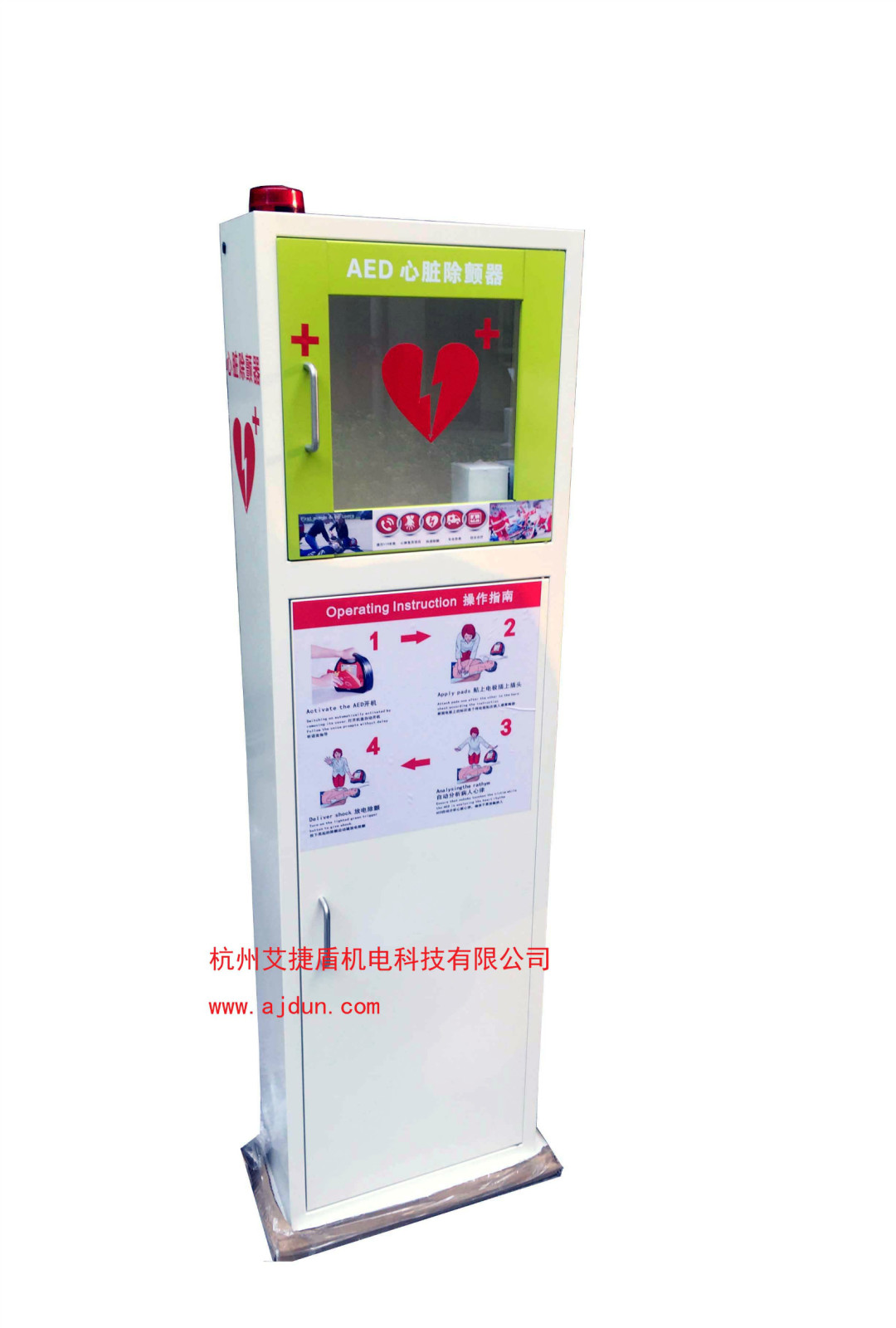 并隨箱配有觸發(fā)式高亮報(bào)警燈及蜂鳴器,在有緊急事件發(fā)生時(shí)一旦開(kāi)啟箱門(mén),即會(huì)觸發(fā)報(bào)警,可使人在最大范圍內(nèi)發(fā)現(xiàn)有急救突發(fā)事件發(fā)生。 透過(guò)存放箱的透明窗可以清楚觀(guān)察箱內(nèi)的aed自檢狀況及整個(gè)機(jī)器的使用狀態(tài)。 存放箱的功能尤其在一些公共社區(qū)及大型工廠(chǎng)車(chē)間中優(yōu)勢(shì)最為明顯,可將存放箱固定于人群密集處,一旦發(fā)生需要急救的狀況,可快捷使用。