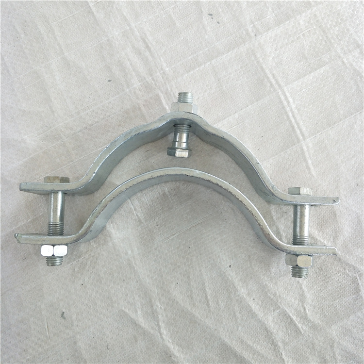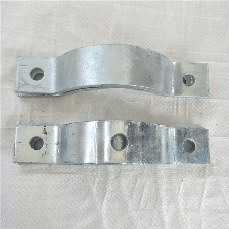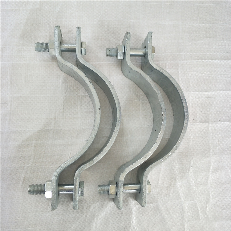 抱箍裝置由箍板、翼板、拉結(jié)筋板、螺栓及內(nèi)襯墊構(gòu)成。 抱箍有好多種,電纜抱箍,電線桿抱箍,拉線抱箍,吊線抱箍,不銹鋼抱箍都是比較常用的. 一種嵌入式抱箍,它是由左、右兩半片抱箍對合后聯(lián)接而成,左、右兩半片抱箍均呈半圓環(huán)狀,半圓環(huán)兩端向外彎折,各形成一個安 裝耳,其特征在于:所述的左半片抱箍一端的安 裝耳上開有嵌槽,相應(yīng)的,與其相配合的右半片抱箍相應(yīng)端的安 裝耳上設(shè)置有銷軸,右半片抱箍一端安 裝耳上的銷軸嵌入左半片抱箍一端安