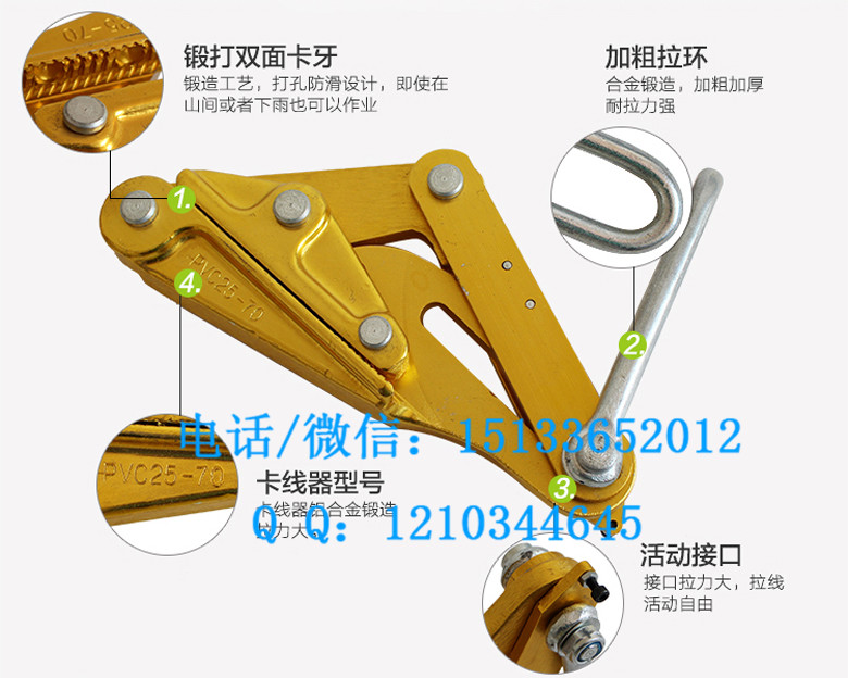 鋁合金絕緣導(dǎo)線卡線器:用于絕緣導(dǎo)線的收線或弧垂調(diào)整。本體由鋁合金制造,自重輕,外型美觀。鉗口為特殊處理,帶倒網(wǎng)紋,不論冬夏都能牢牢抓住線纜,不脫落,不傷導(dǎo)線外護(hù)套鋁夾頭緊固器 鋁卡頭型號(hào)適用導(dǎo)線額定負(fù)荷